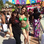 Hair stylist Sage got their hair and makeup ready at the Studio first. Then while Robin and artist John painted the models, Sage bolted to the Palms Pool to help the temporary tattoo team set up. Temp tattoo artists Alex, Corina, Stephanie toiled away giving out SoBe tats to the good-looking pool partygoers.